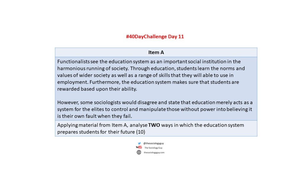 Today’s questions is a relatively straightforward one. Last year the 10 marker was on Marxism and how education serves the needs of capitalism – today I am going to look at Functionalism. See if you can extract two hooks and develop them from the following question. It is also worth looking at the second paragraph in the item, as even though it is not explicitly about Functionalism, it is useful to be able to evaluate using aspects of the item.