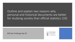 Another form of 10 mark Theory and methods question is a comparison between two different forms of research methods. This was seen on Paper 3 in 2017 where the question asked to compare overt and covert participant observation with the premise that overt was preferable to covert. This presents a few problems for students who have learnt research methods in isolation and is worth practising in the run up to exams. doing these types of questions serves a secondary function of enabling student to develop their skills of evaluation for potential research methods only essays – ‘advantages of unstructured interviews in 2018 relied upon the disadvantages of that method as evaluation. So, a more complex 10 marker today, looking at secondary sources.