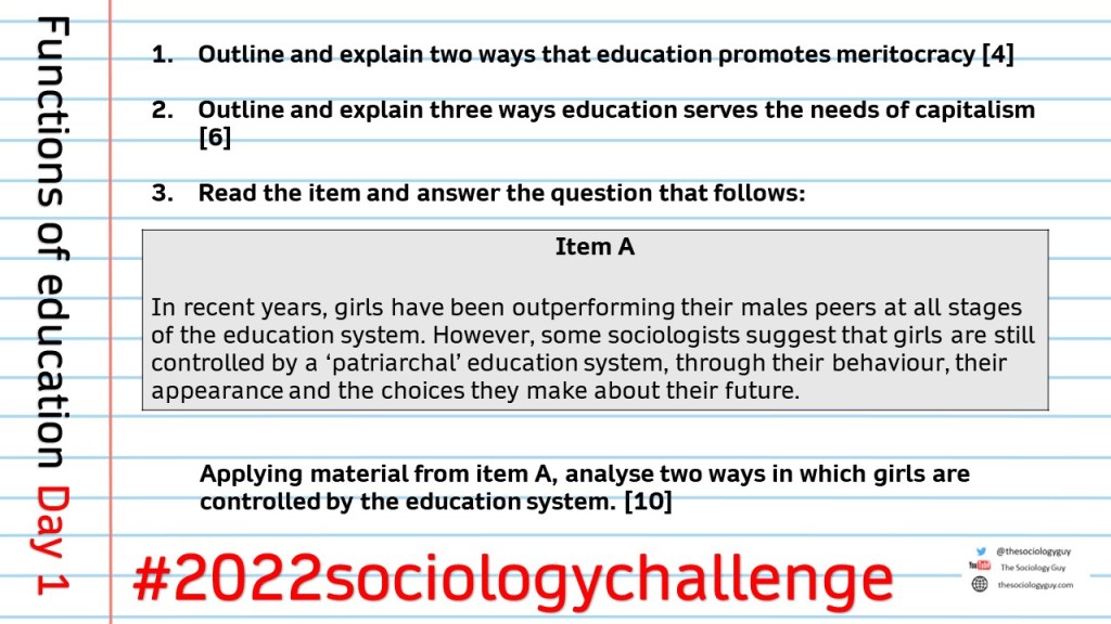 The first question asked students to outline 2 ways in which schools promote meritocracy. A commonly asked question – in fact in the 2021 November Exam, the 30 mark essay question was on meritocracy in the education system. 4 and 6 markers are broken down into 2 (or 3) sets of two marks – so students would get one mark for identifying a way, and a second mark for explaining how this happens. Through the day I sent out an image, highlighting some of the ways this is done.
