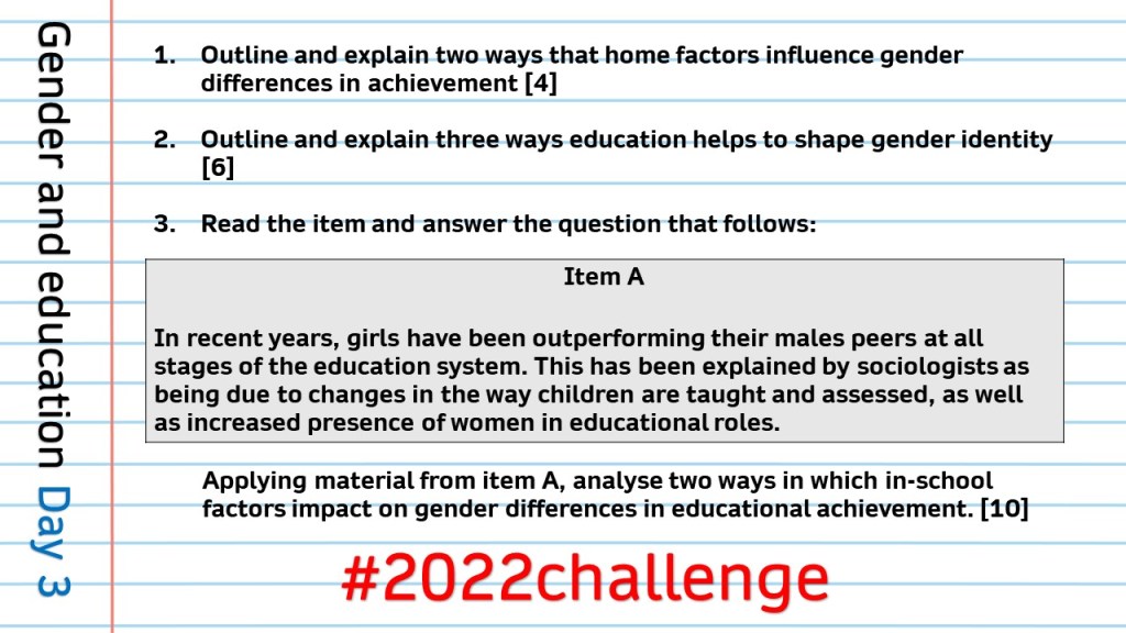 Today’s challenge focused on social class and education – an area that has often been examined, including as a 30 mark question. When students are approached with social class questions, their focus is often on how working-class pupils underachieve, rather than why there are differences between the two groups. If a questions asks about ‘social class’ then students can draw upon explanations of both middle-class achievement and working-class underachievement, and often, it’s really useful to make comparison better the experiences of both groups in the education system. Doing this demonstrates one of the higher order skills on the AQA specification – Analysis.