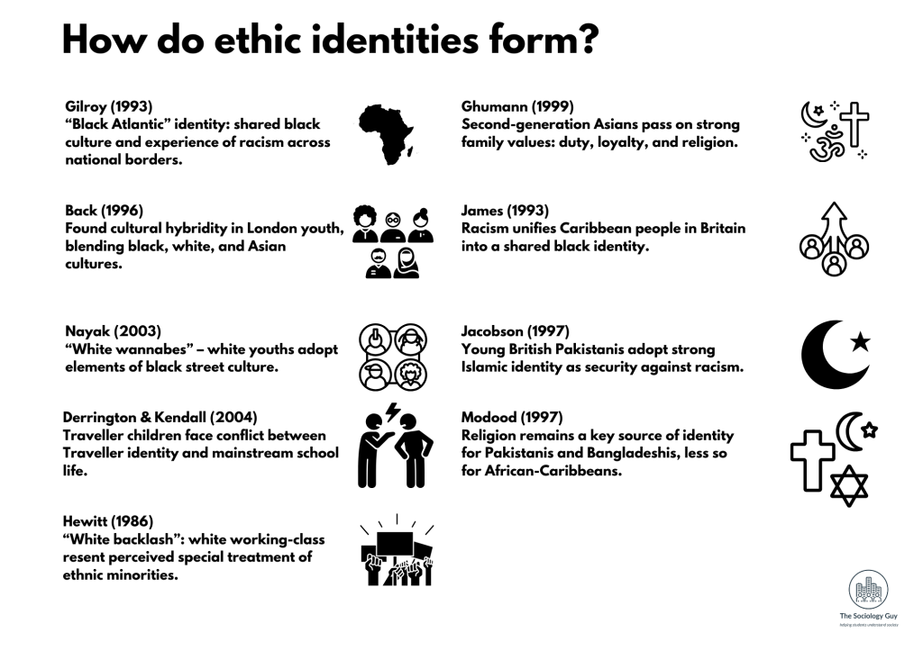✅ These studies show that ethnic identities are not static; they are fluid, hybrid, and influenced by wider society.