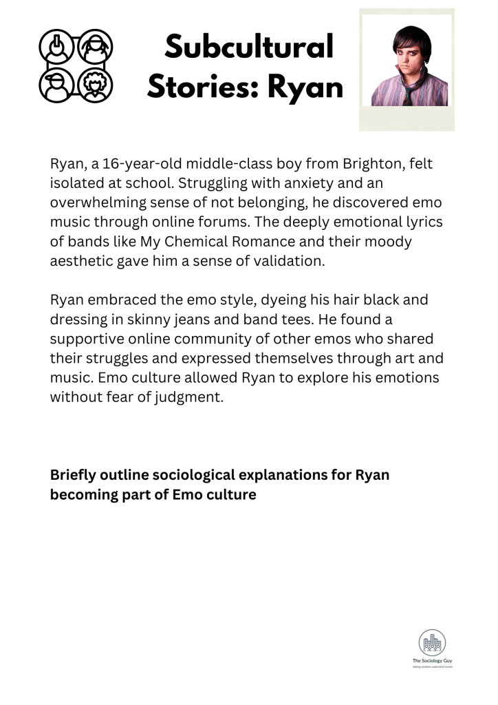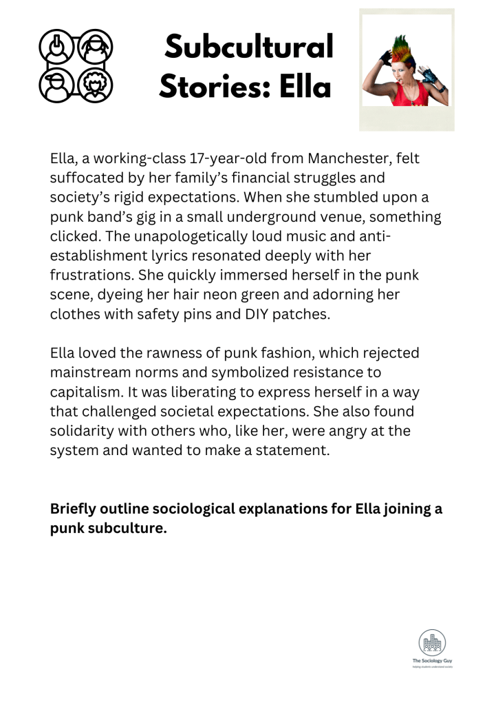 The resource presents students with short fictionalised case studies of young people—Ella (punk), Ryan (emo), Aisha (goth), Jamie (mod), Callum (rocker), Mia (raver), and Darnell (grime). Each vignette captures the cultural styles, values, and motivations behind their subcultural participation. Students are then asked to briefly outline sociological explanations for each character’s involvement.