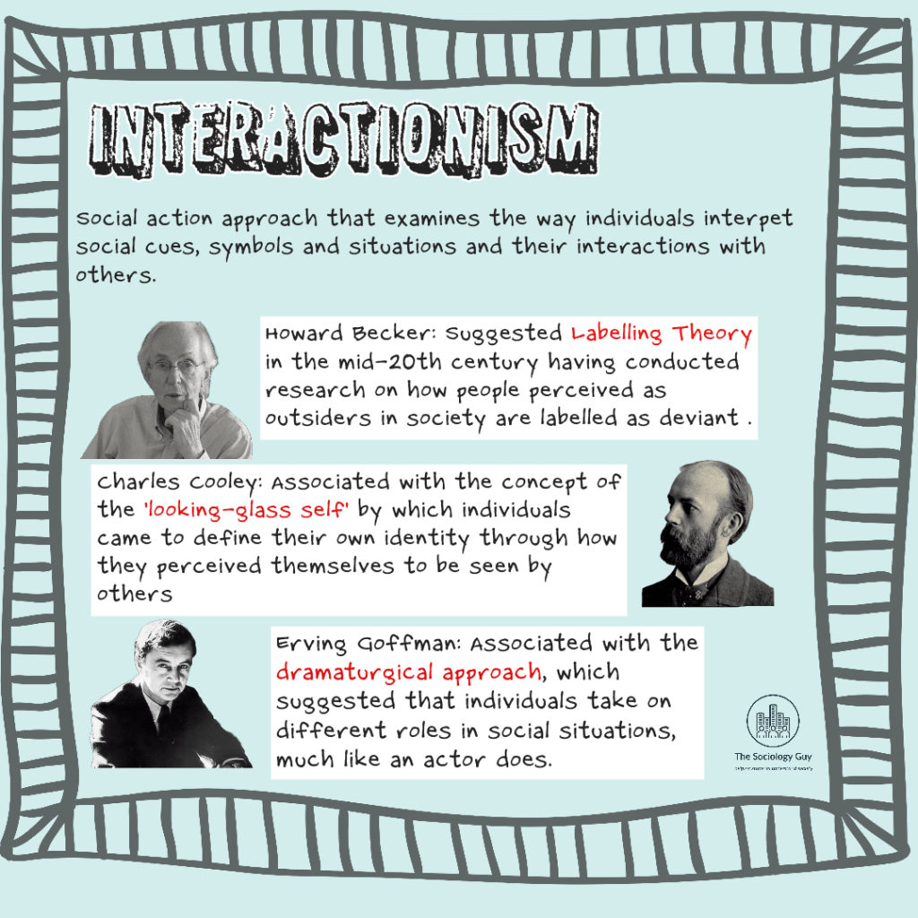 Interactionism is a broad term that describes many different sociological approaches that look at society from a social action viewpoint – suggesting that individuals interpret social cues and interactions and this influences their behaviour. This can include various approaches underneath a broad umbrella term of interactionism/interpretivism, including (but not limited to), symbolic interactionism, labelling theory, phenomenology and ethnomethodology to name but a few.