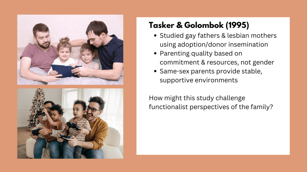 Tasker and Golombok investigated gay fathers and lesbian mothers who used adoption or donor insemination. Their research confirmed that same-sex parents are capable of providing stable and supportive family environments, emphasizing that parenting quality is determined by commitment and resources rather than gender composition. These findings are useful for evaluating theories of family diversity and challenging the traditional functionalist focus on the nuclear family. - Legal and Policy Research