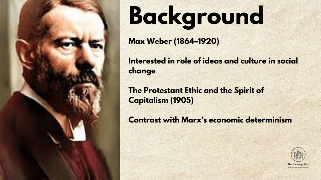 - Beliefs in Society: Weber provides a cultural explanation of social change, contrasting with Marx’s economic determinism. Religion is not just conservative – it can be a force for radical change.