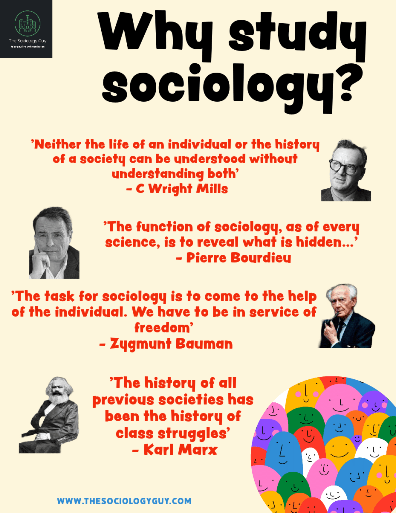 Sociology is often seen as a ‘soft subject’ without any real evidence to back up the claim that it is easier than other subjects. Sociology deals with the study of society and those that study sociology deal with both social and sociological issues. Sociologist are concerned with both the structure of society and how individuals within that society interact with one another. As such, they study the role of both social institutions (the media, education, family, work, government, religion etc…) and the behaviours of individuals in society.